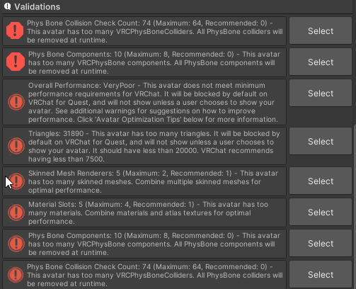 2 Mesh Renderers4 Material Slots8 Physbone Components64 Physbone Collision Checks