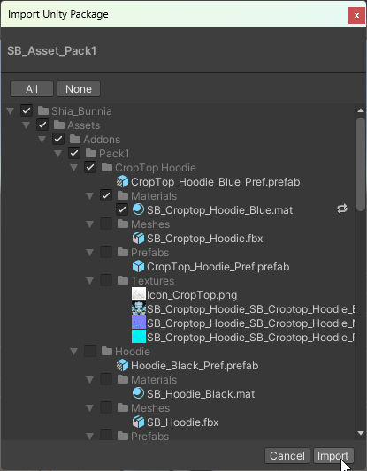 Import your Unity Package into the scene by Double Clicking Shia_Bunnia.unitypackage An import window will appear. Click Import.