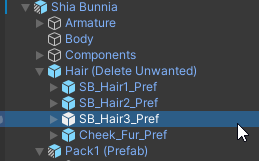 Assetsfolder. Just drag and drop the prefab âShia Bunniaâ into your scene again, or if that has been edited, drag and drop the prefab from theAssets/Addons/Base/Hairfolder directly onto your characters hierarchy.